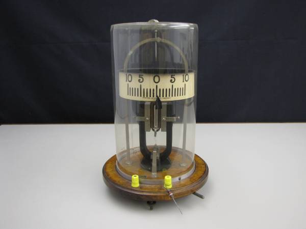 All of the working parts of this simple, open galvanometer are clearly visible, making it easy for one to understand how this sensitive current-measuring device works. By placing a large resistor in series with the galvanometer, one may also show how it can be used as a voltmeter.