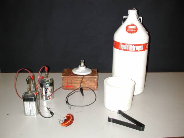 A light bulb is powered in series with a coil of thin copper wire. Initially the coil is at room temperature and, because of its resistance, the bulb is only faintly lit. When the coil is immersed in liquid nitrogen, its resistance is quickly and substantially reduced causing the bulb to glow very brightly.