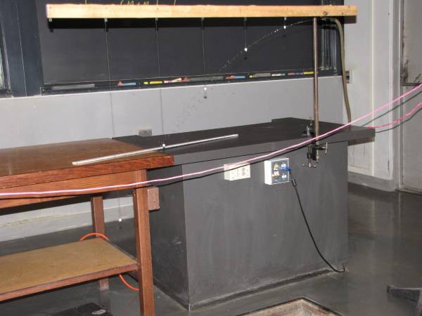 A water jet is emitted from a horizontal nozzle. A series of weighted, evenly-spaced strings hangs from a horizontal rod which is mounted at the same height as the nozzle. The arc of the water jet follows the curve described by the ends of the strings and, by measuring the length of the strings, is shown to be a parabola.