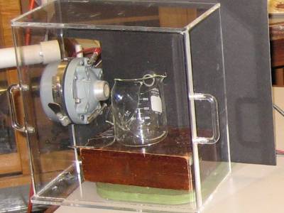 A sine generator is used in conjunction with an audio amplifier and a horn loudspeaker to generate a powerful, single frequency tone. The sound waves will cause a common Pyrex beaker to vibrate. If the frequency of the generated tone matches the dominant resonant frequency of the beaker and the sound waves are strong enough, the beaker will break.