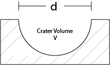 Assume that a spherical crater is formed by ejecting material; the size of the crater is proportional to the amount of material which was ejected. If the material has a uniform density, then the total mass of the removed material, $M$, is proportional to the volume of the crater, $V$, which is in turn proportional to the crater diameter cubed, $d^3$: $M \propto V \propto d^{3}$. (See Fig. 1.)