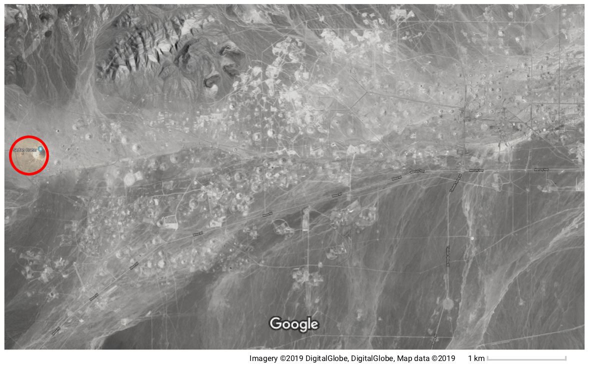 Figure 4: The Nevada Test Site with the Sedan Crater marked on the far left. (Image via Google Maps.)