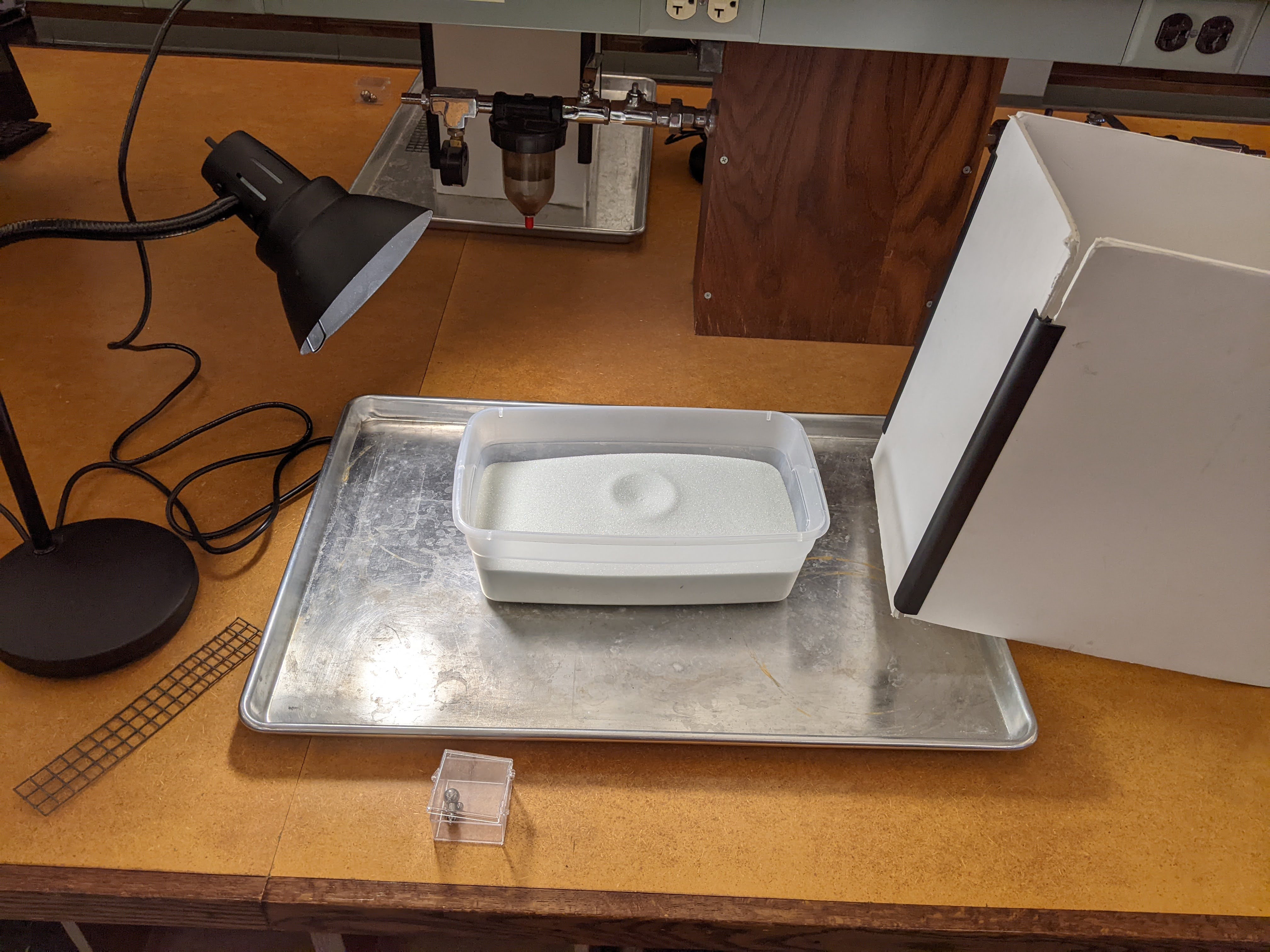 You have a number of different size steel ball bearings (impactors) and a container of fine sand of uniform grain size, along with some other pieces of equipment. Spend about 15 minutes making some initial observations using the setup, with a focus on testing possible procedures for releasing the ball bearing and measuring craters.