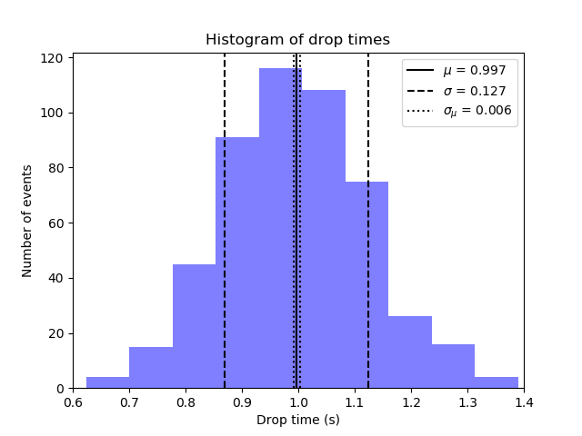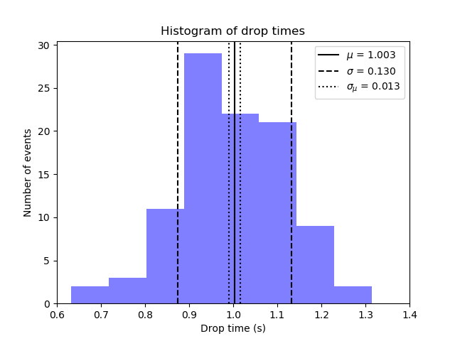 Now, return to your drop data and the data from the other group you spoke with. Compute the standard deviation of the mean and use the $t^{\prime}$ criteria you learned last week to look for agreement between your average value and that of the others. Are your results in agreement with the others? In disagreement? Inconclusive?