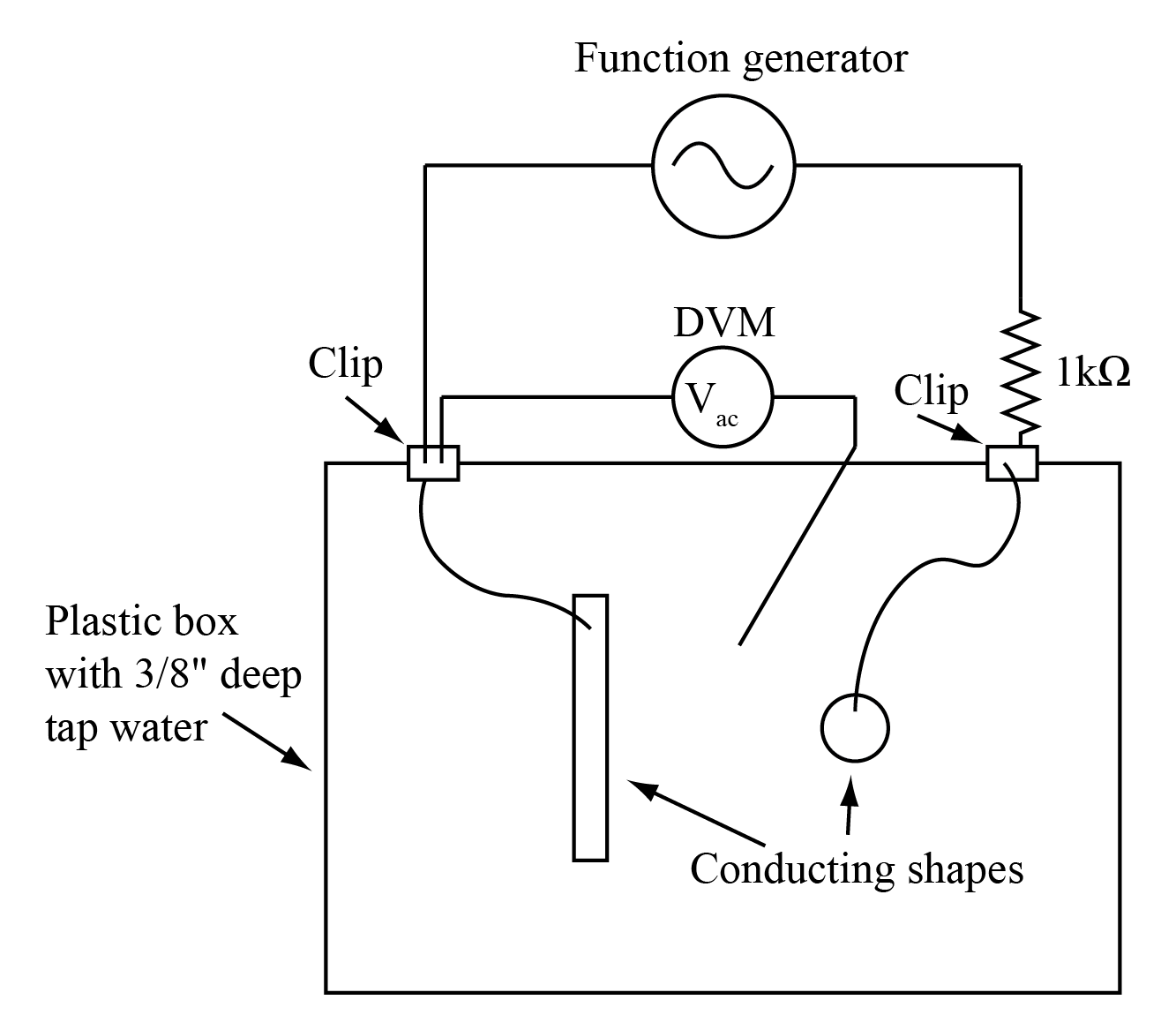 Attach the black cable from the function generator and the DVM to the same binder clip on the edge of the plastic water tank. Make sure the red cable from the function generator is attached to the resistor on the other binder clip. Set two metal electrodes at convenient locations on the grid in the tank and connect them each to one of the binder clips using the attached wires.