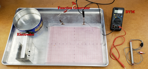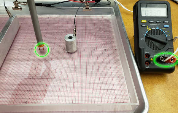 You are also provided with a probe consisting of two wires, held a fixed distance apart. When its banana plugs are plugged into an AC voltmeter and its tips are inserted into the water, the probe will measure the electric field in volts/distance.