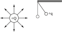 A small positive test charge $+q$ at any point in the field experiences a radial force of repulsion directed outward from $+Q$; the lines of force are therefore drawn with arrows to pointing outward. (If $Q$ were a negative charge, these lines would be directed inwards to indicate an attraction of the positive test charge $+q$.) Near $+Q$, the lines are close together as the field strength is strong. Moving outward, the density of the lines decreases (and so does the field strength).