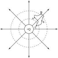 Conservation of energy requires that the work done must be independent of path over which the charge is transported. For example, consider moving a charge from point $\mathrm{B}$ to $\mathrm{C}$ and back to $\mathrm{B}$ in Fig. 3. One can calculate the amount of energy required to move along path $a$ and one can independently calculate the amount of energy required to move along path $b$. However, since the full return trip ($\mathrm{B}$ to $\mathrm{C}$ to $\mathrm{B}$) should result in zero net change in energy, we see that the energy along each individual path – $a$ or $b$ – has to be the same.