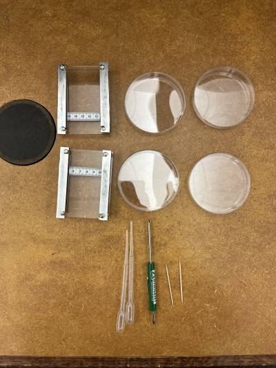 Let us first get acquainted with the experimental apparatus and samples we will be working with. To perform the experiment, we have provided you with an electrophoresis tray table, a picture of which you can see in Figure 4. It consists of a flat surface with a rectangular well at either end. In this well we can insert rectangular graphite electrodes that we can charge by connecting the metal pins that keep the electrodes in place to the positive and negative leads of a power supply.