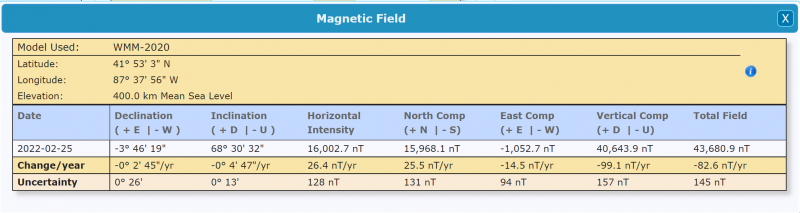 The Earth's magnetic field in Chicago can be estimated using the NOAA Magnetic Field Calculator https://www.ngdc.noaa.gov/geomag/calculators/magcalc.shtml?#igrfwmm as shown in the screen shot below.