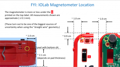 It may be useful to know the precise location of the magnetometer in the iOLab device. The image below gives that information.