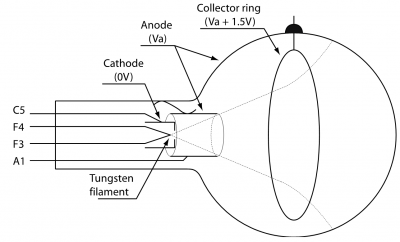 The anode is held at a potential, $V_a$, which is more positive than the cathode. Thus, electrons generated at the cathode are accelerated to a kinetic energy of $K = eV_a$ by the time they reach the anode can. In the absence of any collector ring potential and with no helium atoms present, the electrons would continue, undeflected, to the inside of the glass tube. However, since the collector ring is held at a potential 1.5 V more positive than its surroundings, the electrons are attracted toward the collector ring as they pass it. The aperture of the anode cylinder is such that these electrons would miss the collector ring.