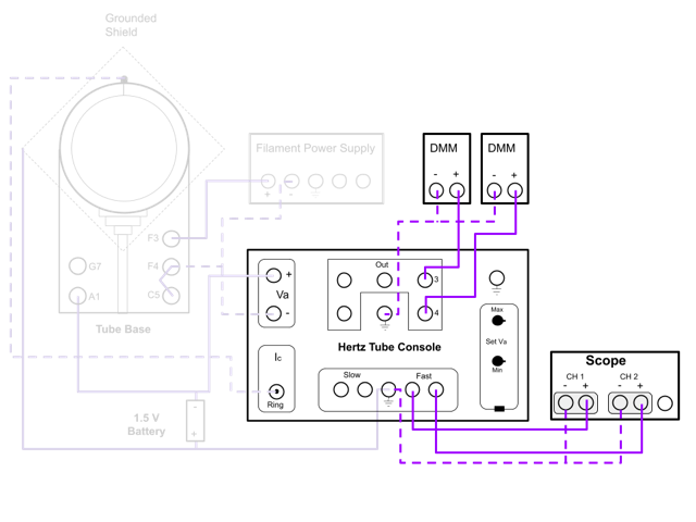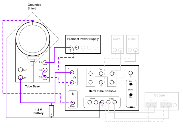 A separate DC power supply provides current to the filament and a 1.5 V battery supplies a small potential to attract electrons to the collecting ring. A digital oscilloscope is used to view and measure the current in the collector ring and the accelerating voltage, $V_a$.
