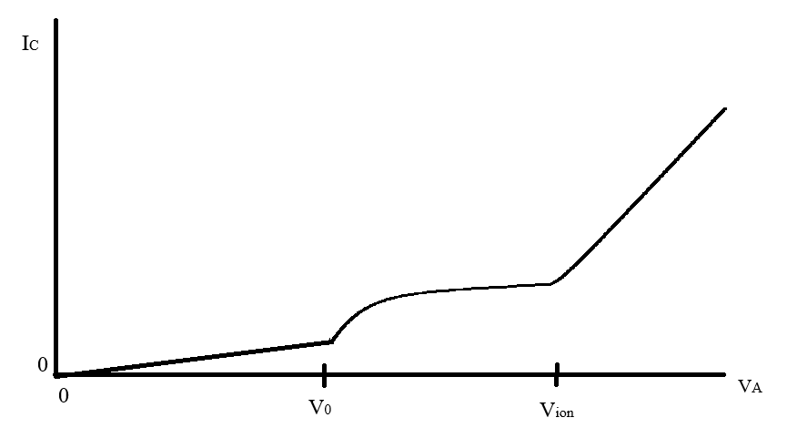 At accelerating voltages below $V_0$ (the energy corresponding to the lowest electron excitation energy), your current signal will likely be flat or nearly flat. As $V_a$ increases from $V_0$ to $V_{ion}$, the signal will increase as some helium atoms are ionized in the following two collision process: the first collision puts the atom in a metastable excited state and then – before the atom can decay back to the ground state – a second collision knocks the electron out of the excited state, ionizing the atom. (This ionization of the metastable state is not what we are trying to measure.) The abrupt change in slope that occurs at $V_{ion}$ represents the onset of ionization from the ground state.