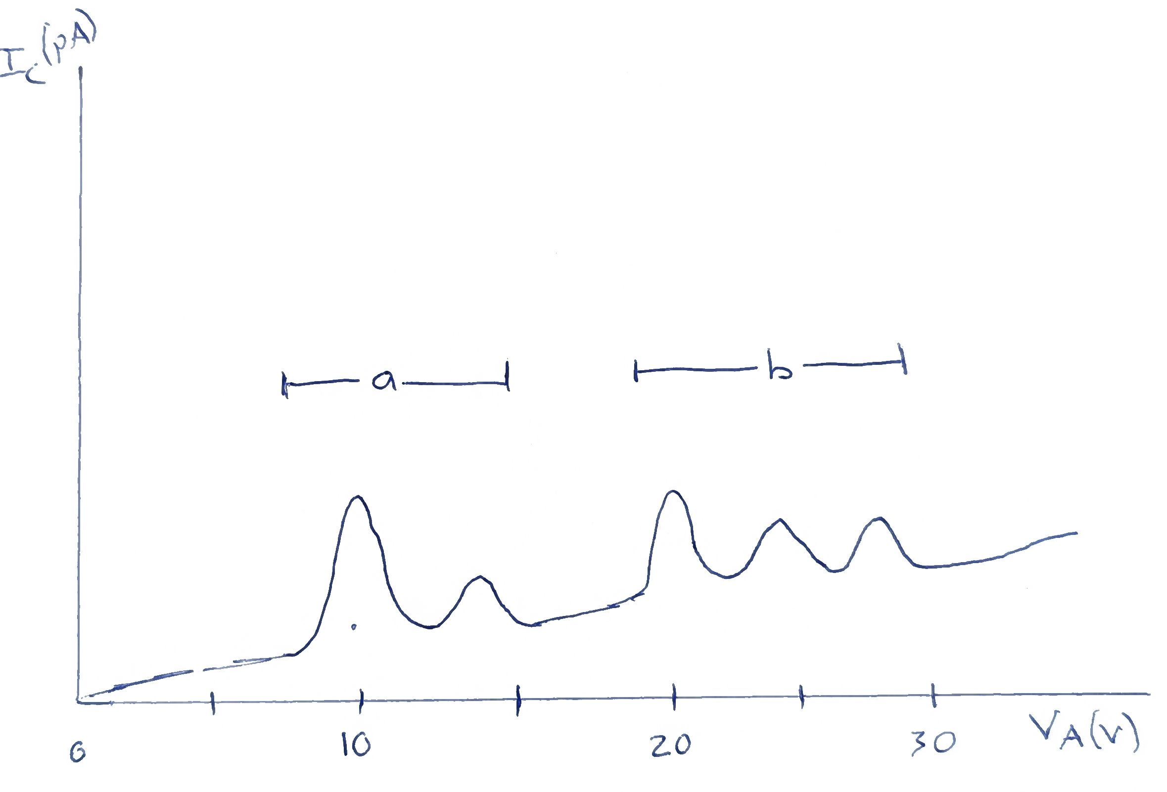 To measure the ionization potential, reverse the 1.5 V battery in its holder so that the positive terminal is now connected to the tube anode. Observe the signal on the scope and adjust $V_{a,min}$, $V_{a,max}$, and the filament voltage until you obtain a signal from the collector ring with the features shown in Fig. 4.