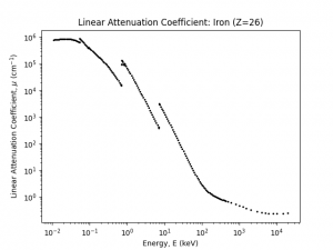 In order to compare your results to literature, we provide a table of data (in text document form) combined from two different National Institute of Standards(NIST) databases: X-Ray Form Factor, Attenuation and Scattering Tables (FFAST) and X-Ray Attenuation and Absorption for Materials of Dosimetric Interest (XAAMDI) . We converted the data density values to linear attenuation for you. This data is plotted in Fig. 6 for aluminum as an example, and is consistent with Fig. 1 above.