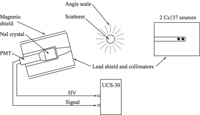 A collimated beam of 662 keV $\gamma$ -rays produced in the decay of cesium-137 is incident on a cylindrical aluminum rod. A PMT+NaI detector which has been magnetically shielded and housed in a Lead PIG is attached to a goinometer allowing it to be rotated about the scattering rod. Pulses from the PMT+NaI detector are sent to a UCS-30 pulse height analyzer (PHA) Spectrum Techniques UCS-30.