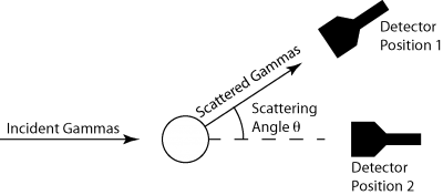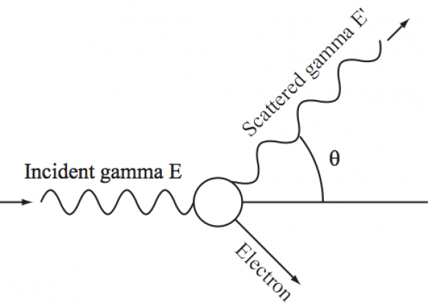 | Figure 1: An incident gamma of energy E “collides” with an electron and scatters with energy E' at angle θ relative to the initial trajectory. |