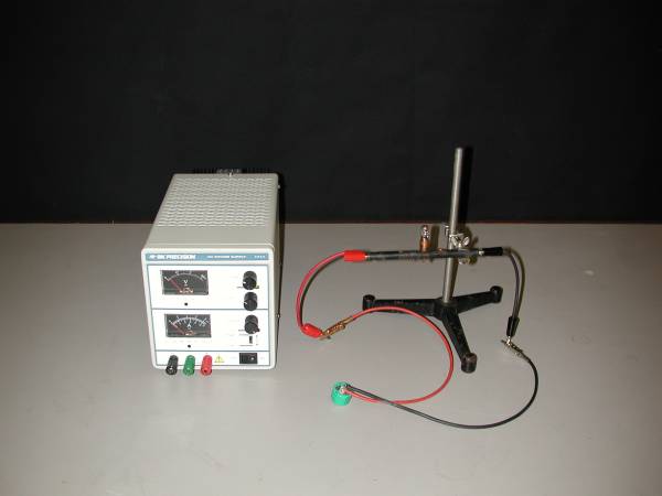 A low-voltage, 1 F capacitor is charged with a power supply and then used to power a small light bulb.