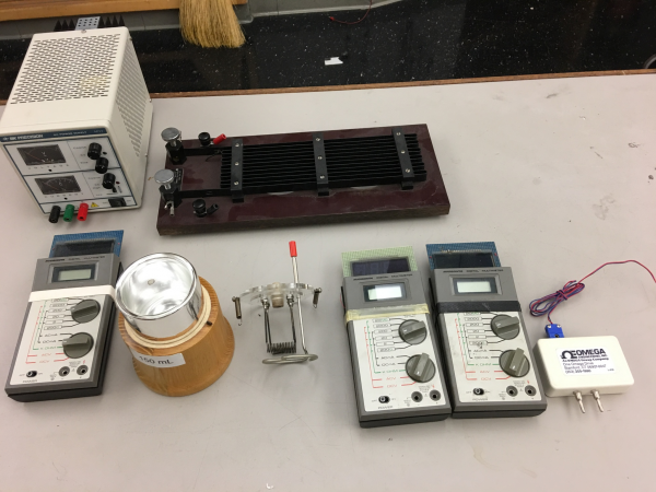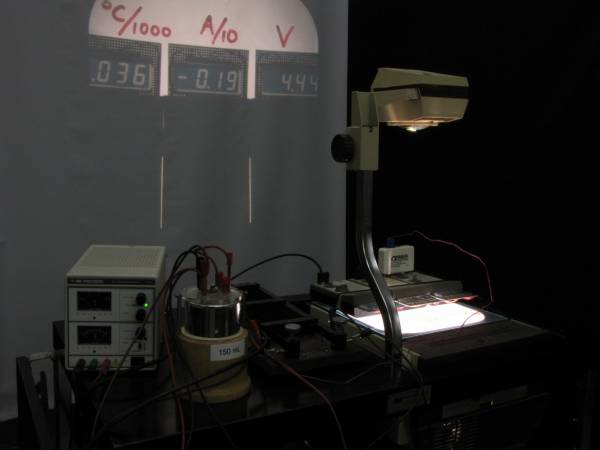 A known current is applied to two one ohm resistors submerged in a known volume of water inside a calorimeter. The current, voltage, and temperature of the water are monitored simultaneously and projected for the class to see.