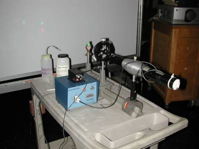Red and green laser light scatters off of particles suspended in solution. The motion of interference fringes results from the Brownian motion of the particles.