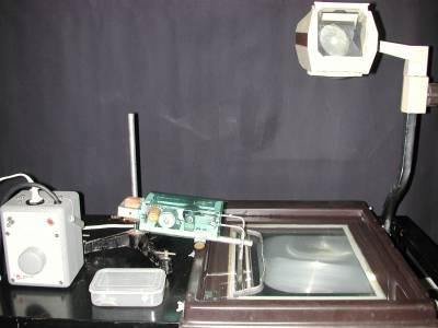 Fill a quarter of the container with water and place over an overhead projector screen. Set up the agitator on a rod stand (you may need to counterbalance its weight using another rod with some mass attached to it pointing in the opposite direction). Install the desired shape (point source, two point sources, plane wave, etc.) and connect the agitator to a variable transformer to have control over its frequency. Place the slit or other desire obstacle in the container and turn on, adjusting the frequency as desired.